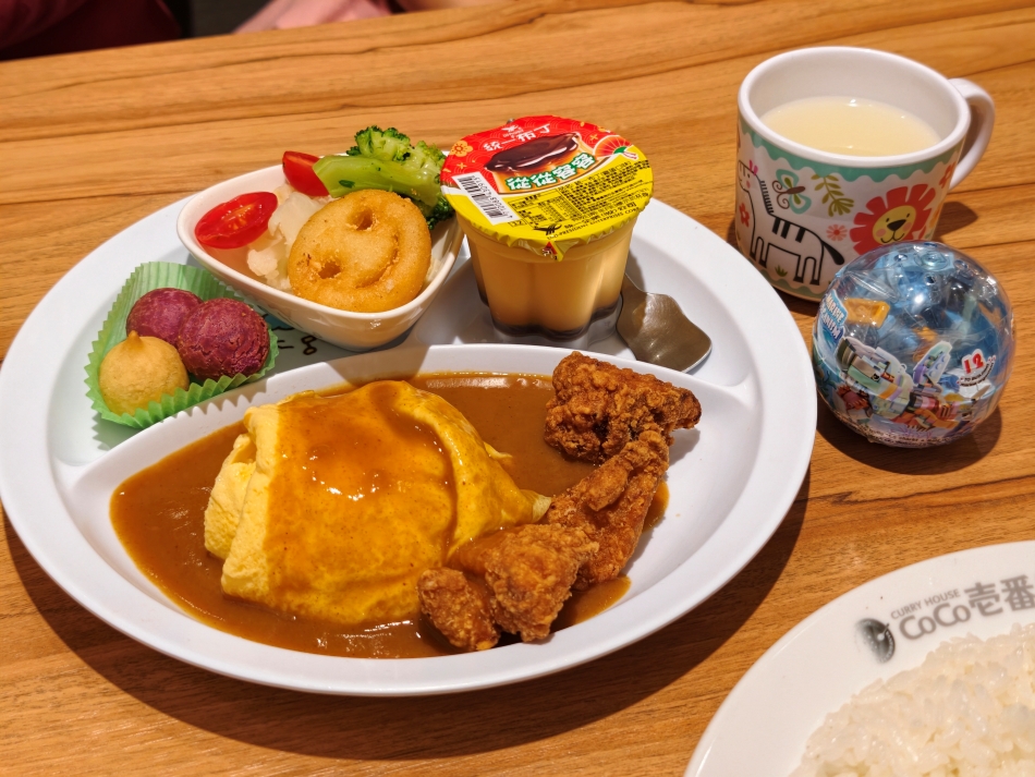 ▼兒童餐雖說是歐姆蛋,但看起來比較類似蛋皮的概念,不過讓小朋友吃全熟蛋也會比較安心一點;另外還有三種蔬菜、微笑薯餅、地瓜球及布丁,吃起來很滿足!兒童餐都會附上一杯飲料及玩具(僅限內用),柳橙汁、可爾必思(原味、水蜜桃)可任選一種,都是小朋友愛的口味,我們選的是水蜜桃可爾必思,搭配咖哩飯很解膩。