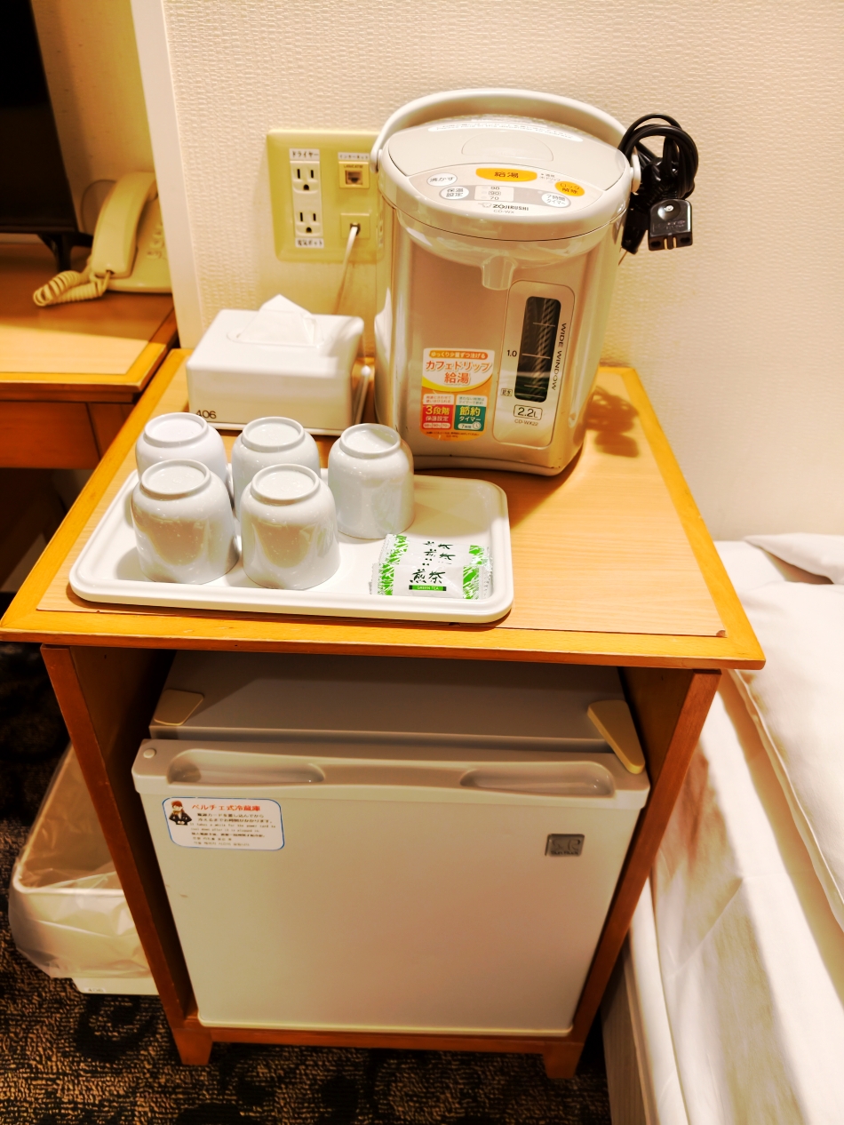 ▼房內附有簡單的桌椅、電視、冰箱、熱水壺、杯子、茶包、衛生紙等,走道空間很足夠,行李箱完全打開也沒問題。