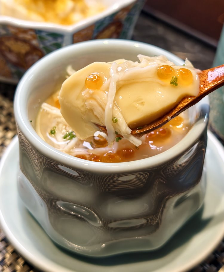 ▼帝王蟹茶碗蒸,金黃蛋液混合了高級柴魚高湯,蒸製成如雲朵般輕盈、如絲綢般滑順的質地,藏在其中的帝王蟹絲絲分明,每一口都能品嚐到蟹肉纖維噴發出的自然甘甜,搭配微爆漿口感的鹹香鮭魚卵、鮑魚更能襯出濃郁海味,在熱氣蓬勃的溫潤蛋香中,多款海味與蟹鮮完全融合成迷人的滋味,帶來一種被溫柔包裹的幸福感。