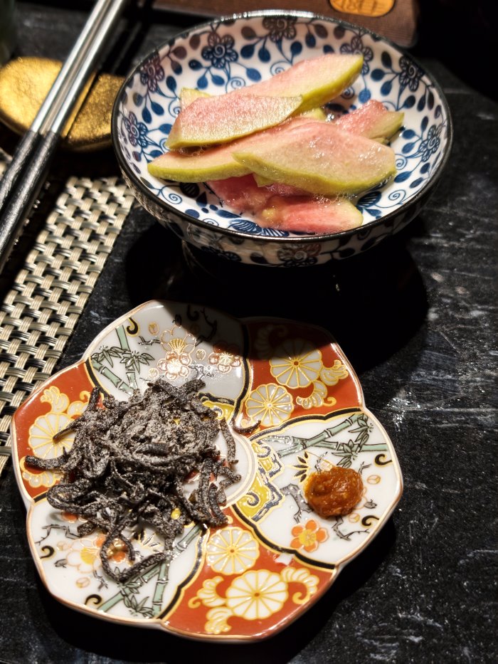 ▼另外備有鹽昆布、紅味噌醬讓大家可以搭配和牛享用,更能提出肉質的香甜;紅心芭樂採用梅漬香醃,甘甜順口又解膩,當作開胃小菜或是飯後水果都很適合。