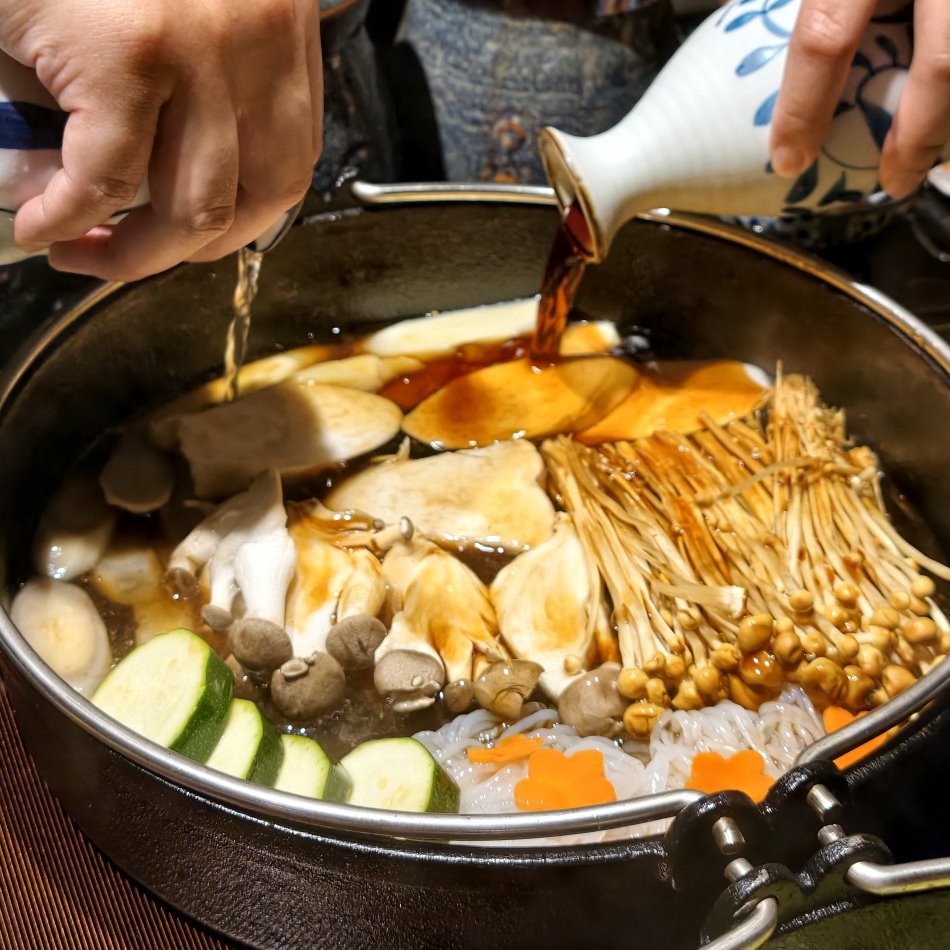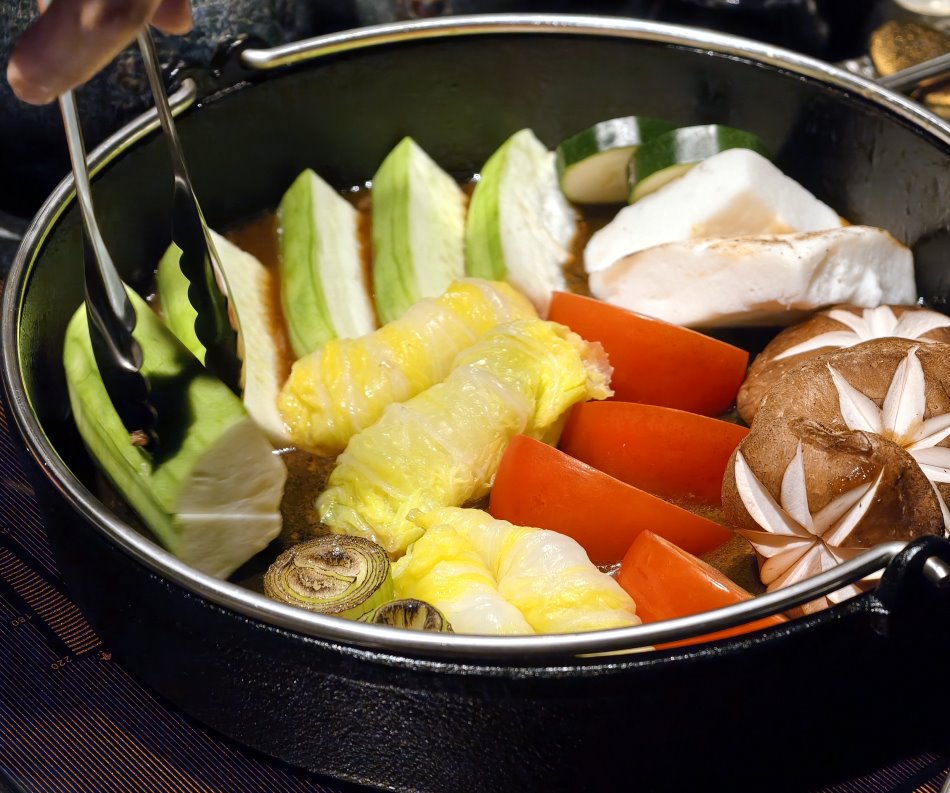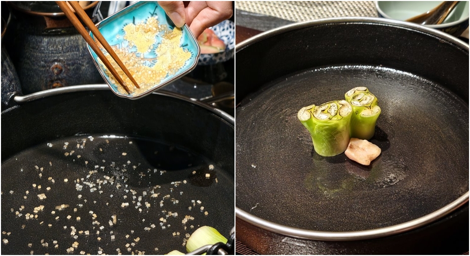 ▼當職人將頂級米澤牛煎烤完畢,鍋底留下了金黃的和牛油脂與焦糖化的醬汁,這正是蔬菜登場的最佳時刻;這裡除了和牛厲害之外,還會搭配季節蔬菜及手作配料,職人會如配置日式庭園般,將食材依序放入鑄鐵鍋內,慢慢鋪陳為鍋中的色彩美學,不僅視覺、嗅覺、味蕾都能一次滿足。