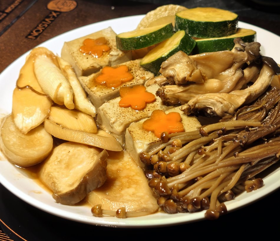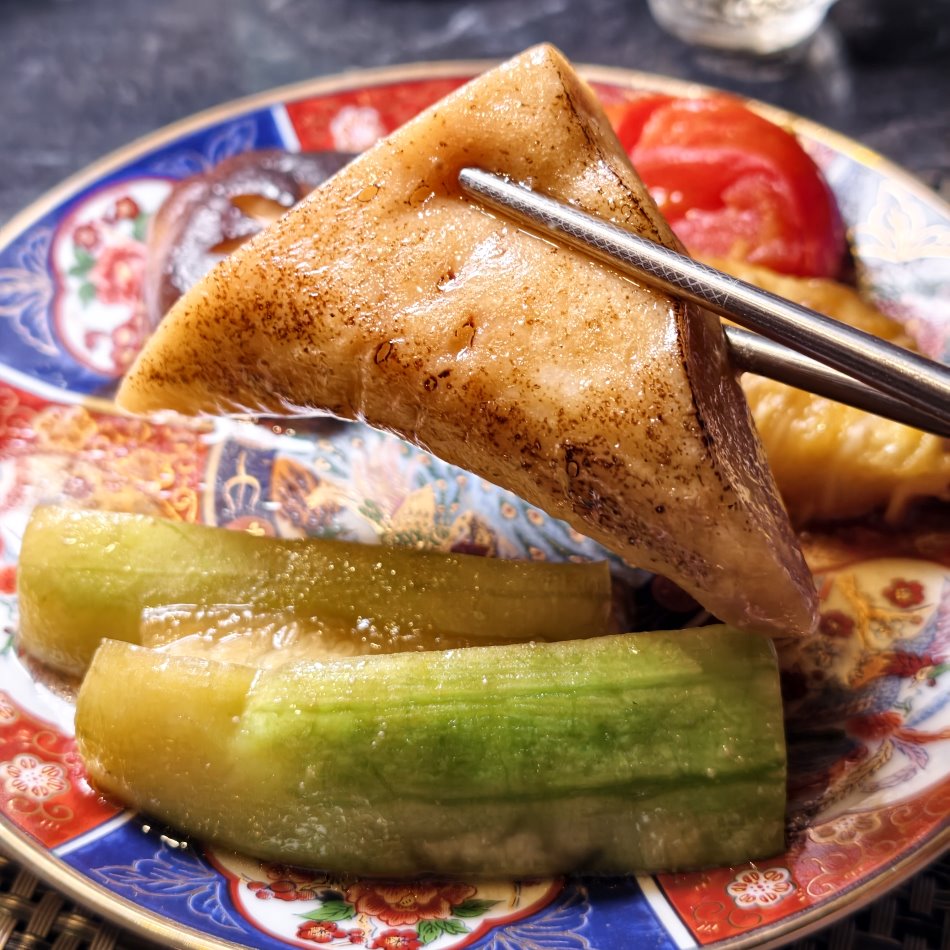 ▼蔬果食材倒入昆布水、醬油下去燉煮,風味堪稱一絕。