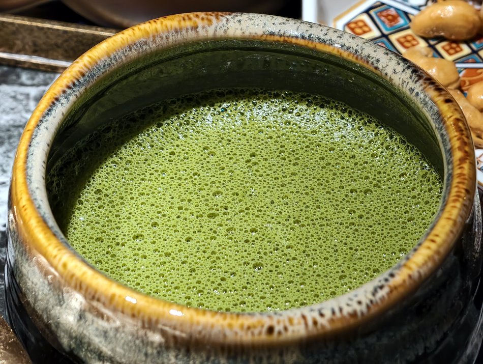 ▼京都抹茶拿鐵盛裝在具有手作觸感的粗陶茶碗中,色澤翠綠且質地細緻,手打過程中產生的微小氣泡,讓抹茶液呈現出一種如絲緞般的光澤,抹茶帶點淡雅清香與微微苦韻,絲滑又回甘。